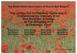 We have produced a simple certificate that towers can request to record the names of ringers who took part in any ringing on 11 November 2018 for the centenary of the Armistice. If you would like one for your tower please send ringers names and tower name to secretary@bacbr.org.uk