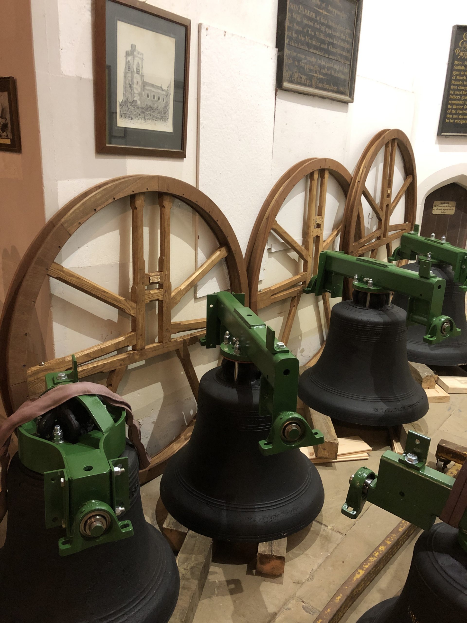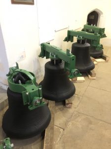 The sound of bells hasn’t been heard in Steppingley for over 30 years but St Lawrence’s existing 4 bells have been refurbished and re-tuned and 2 bells (generously given by the Keltek Trust) have been added to make a new ring of 6. The existing frame has been strengthened and a new section added to hang the 2 new bells. A sound management system has been installed. The bells should be be hung and ringable by mid February. The bells were blessed by the Bishop of Bedford at a service held on 10 February when the bells were on the floor of the church.
